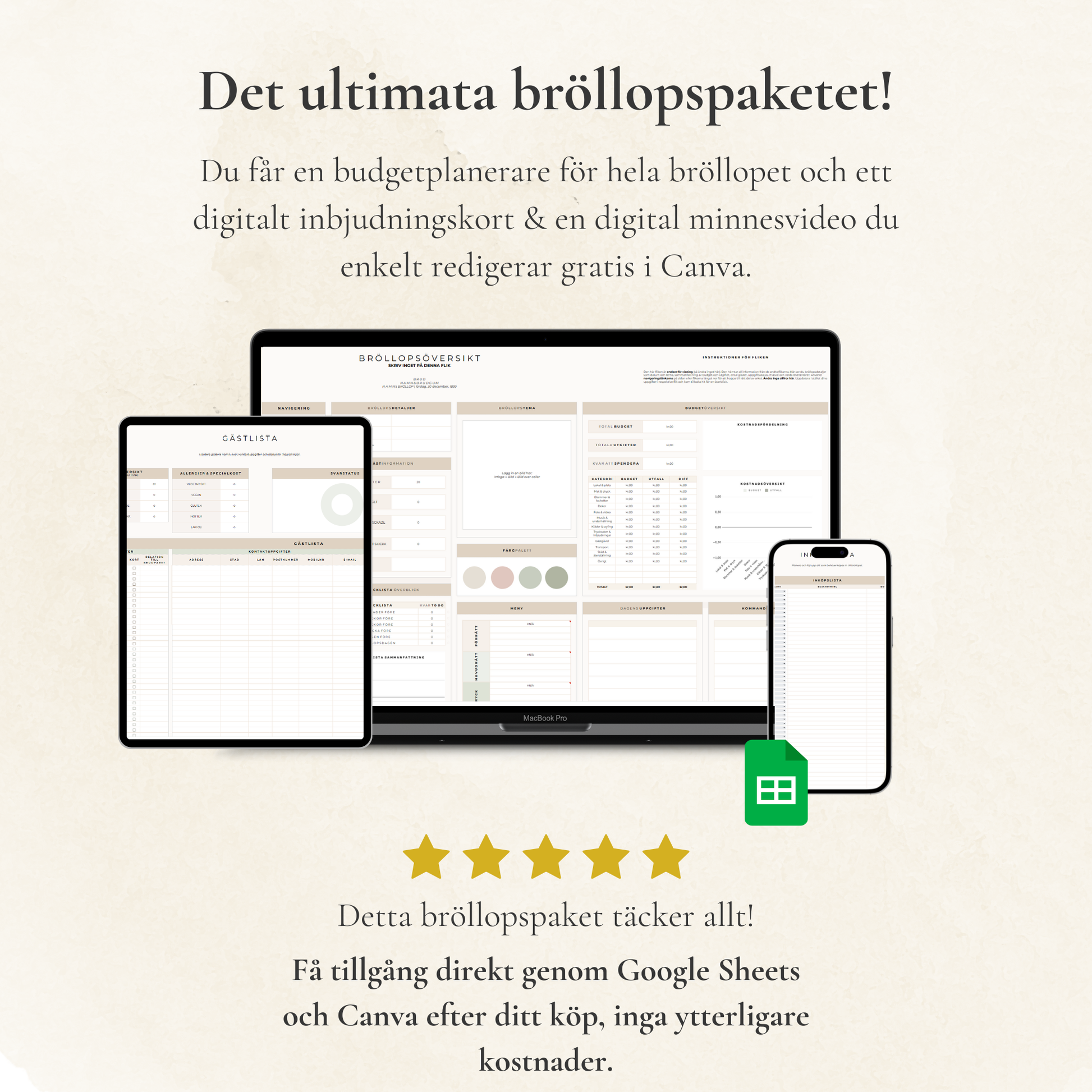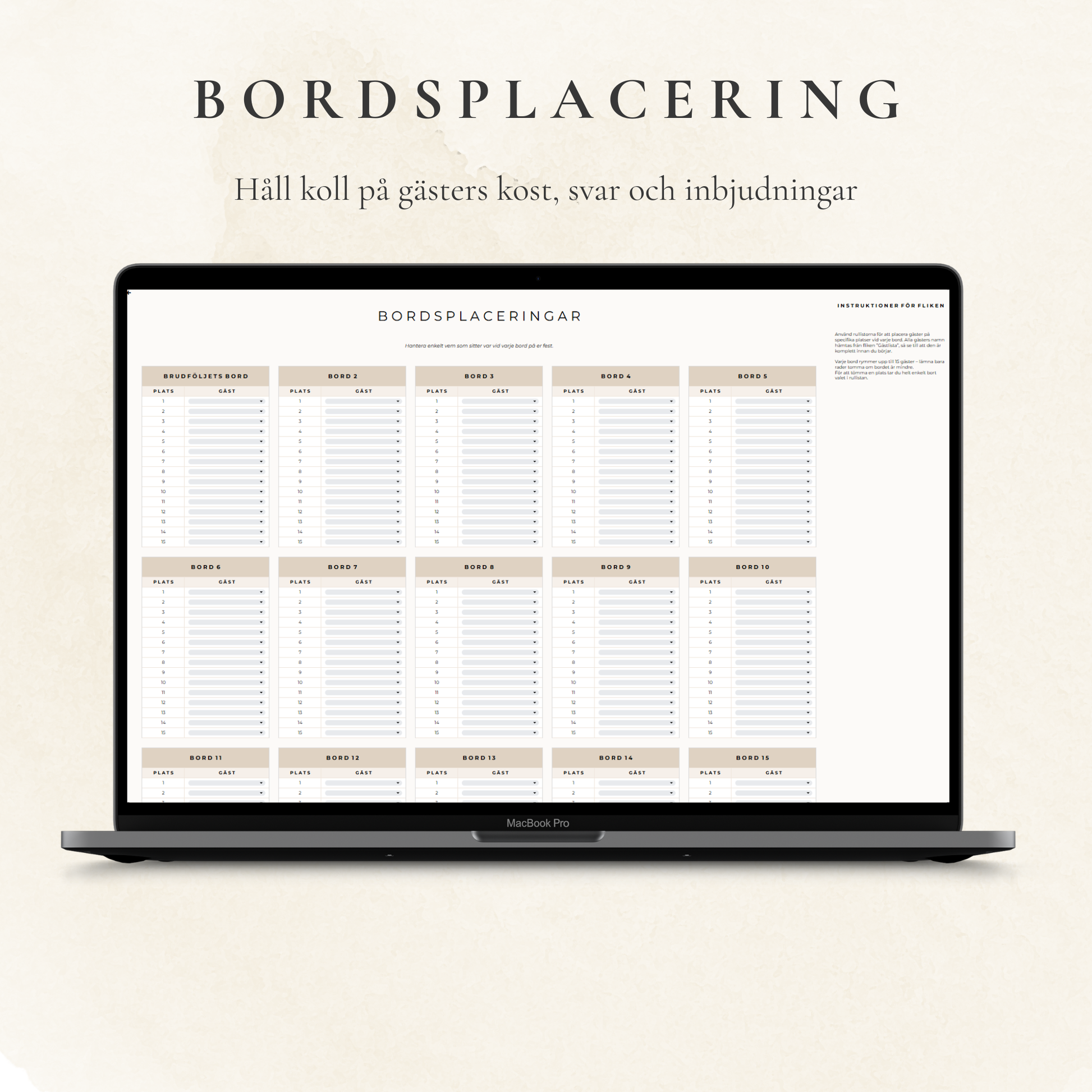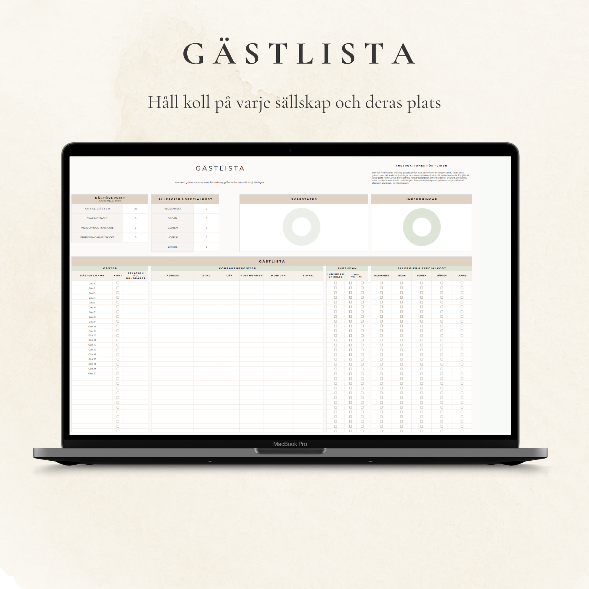 Ni får en komplett mall med allt på ett ställe – budget, gästlista, menyer, sittplatser, allergier, leverantörer och mycket mer. Allt är redan uppbyggt åt er med tydliga kategorier och smarta översikter som gör det lätt att hålla koll, även när detaljerna blir många.